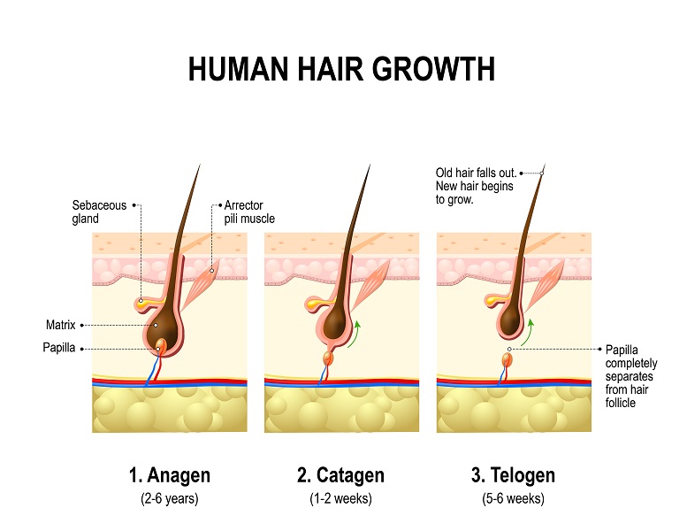 ويعتبر الشعر غنياً بصبغة الميلانين، وتتكون دورة حياة الشعرة من ثلاث مراحل: